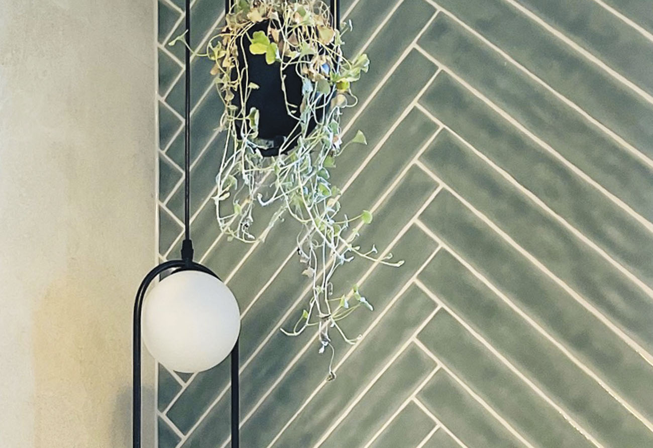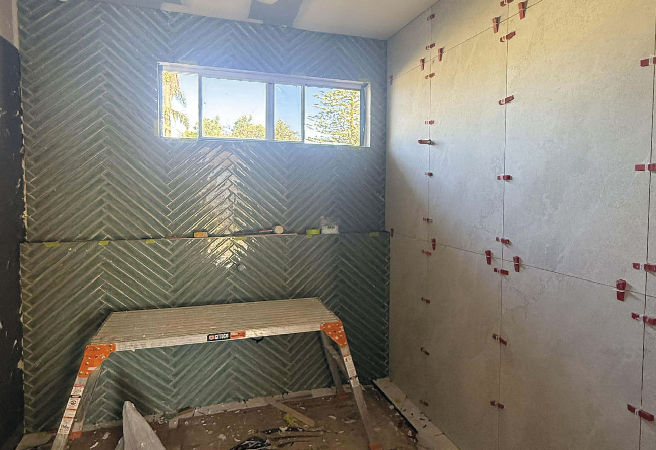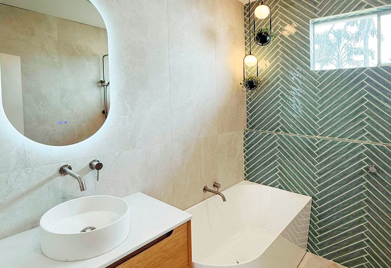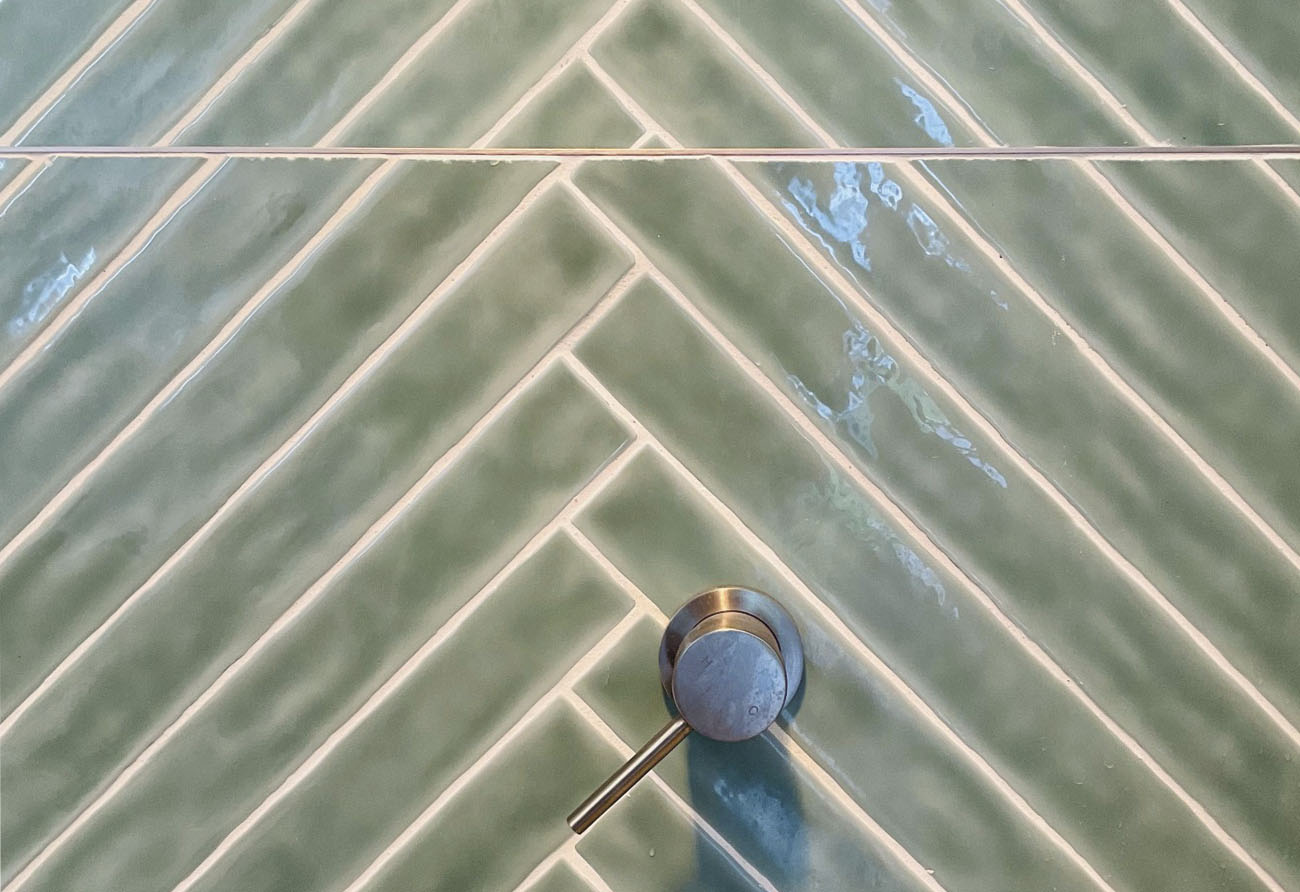 Featuring a stunning green herringbone tiled wall with a shower shelf, oversized large-format wall tiles and beautiful crazy-laid natural stone flooring, this bathroom renovation created a relaxing space with an open feel. Overcoming the challenges of the dated existing bathroom, the final result is now much more accessible, private, and enjoyable to use.