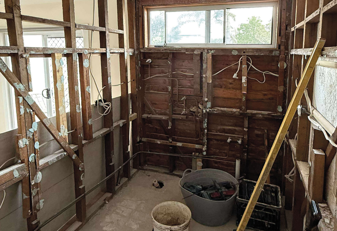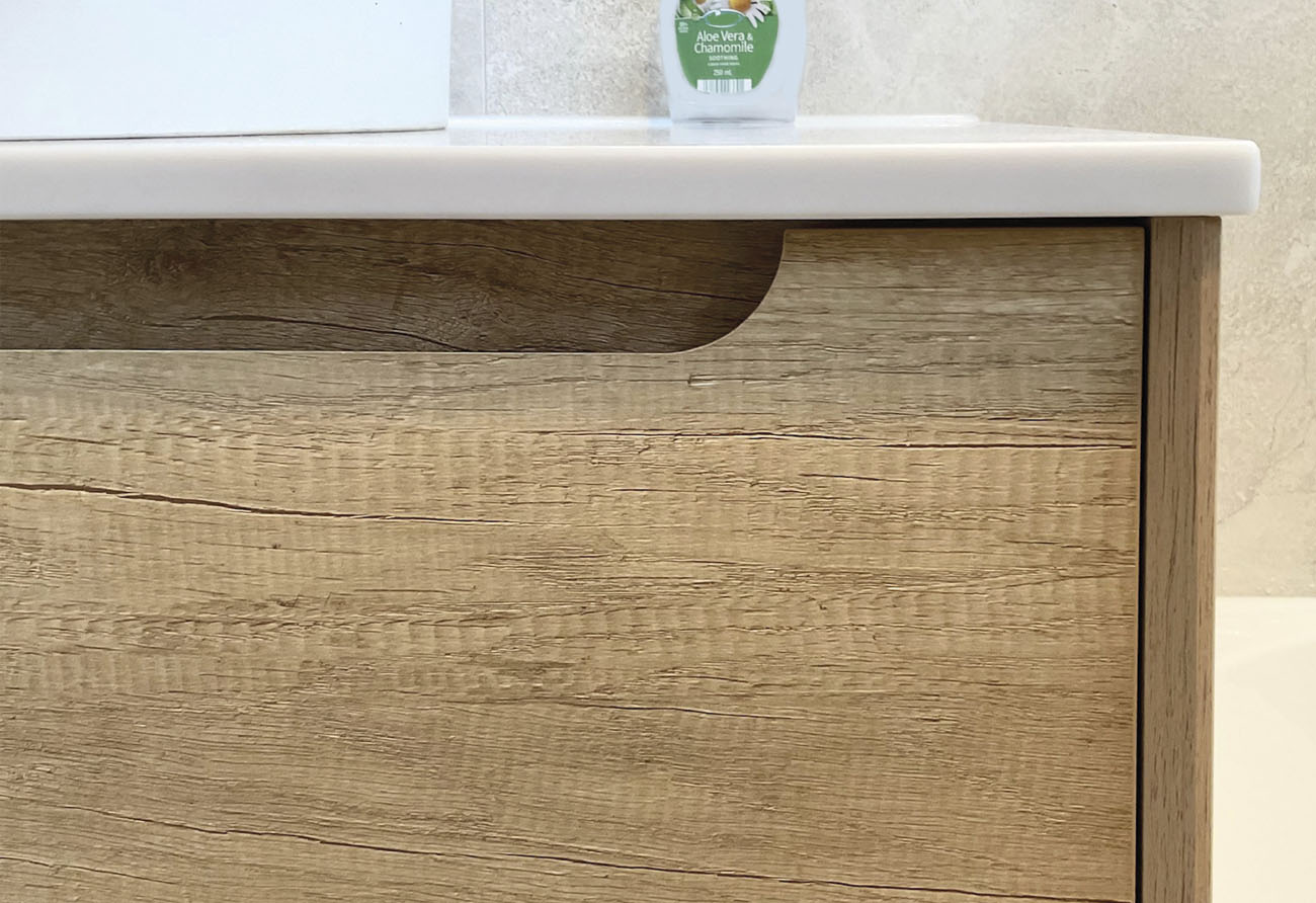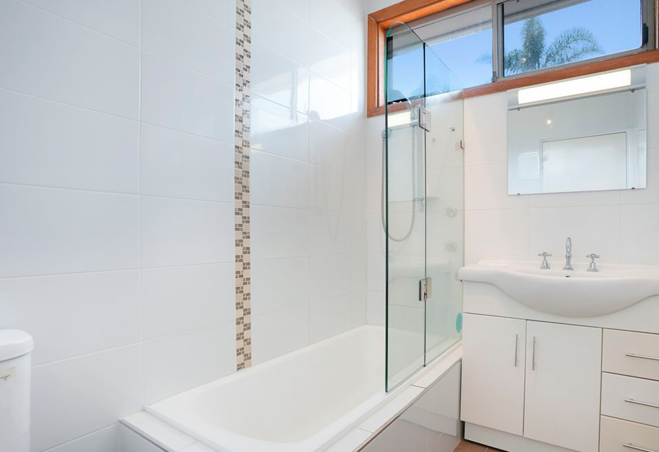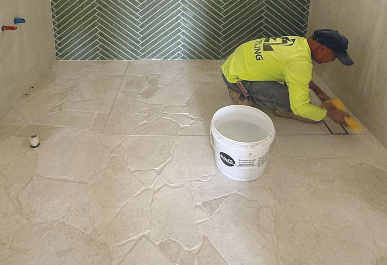 Featuring a stunning green herringbone tiled wall with a shower shelf, oversized large-format wall tiles and beautiful crazy-laid natural stone flooring, this bathroom renovation created a relaxing space with an open feel. Overcoming the challenges of the dated existing bathroom, the final result is now much more accessible, private, and enjoyable to use.